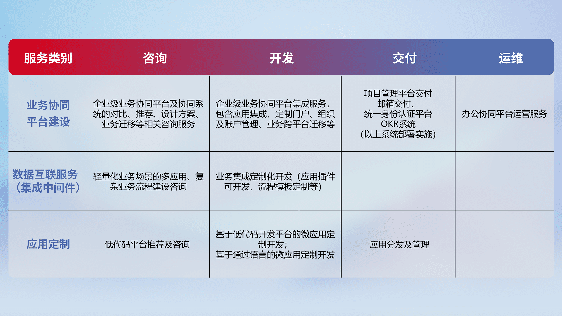 针对钉钉、、、、企微、、、IDaas等平台级产品提供产品的规划、、方案、、、交付、、、定制化开发等服务,,,,实现如统一协同办公、、智能客户服务、、、、混合会议管理、、智能数据查询、、、、等业务场景,,,,实现数字化转型。。