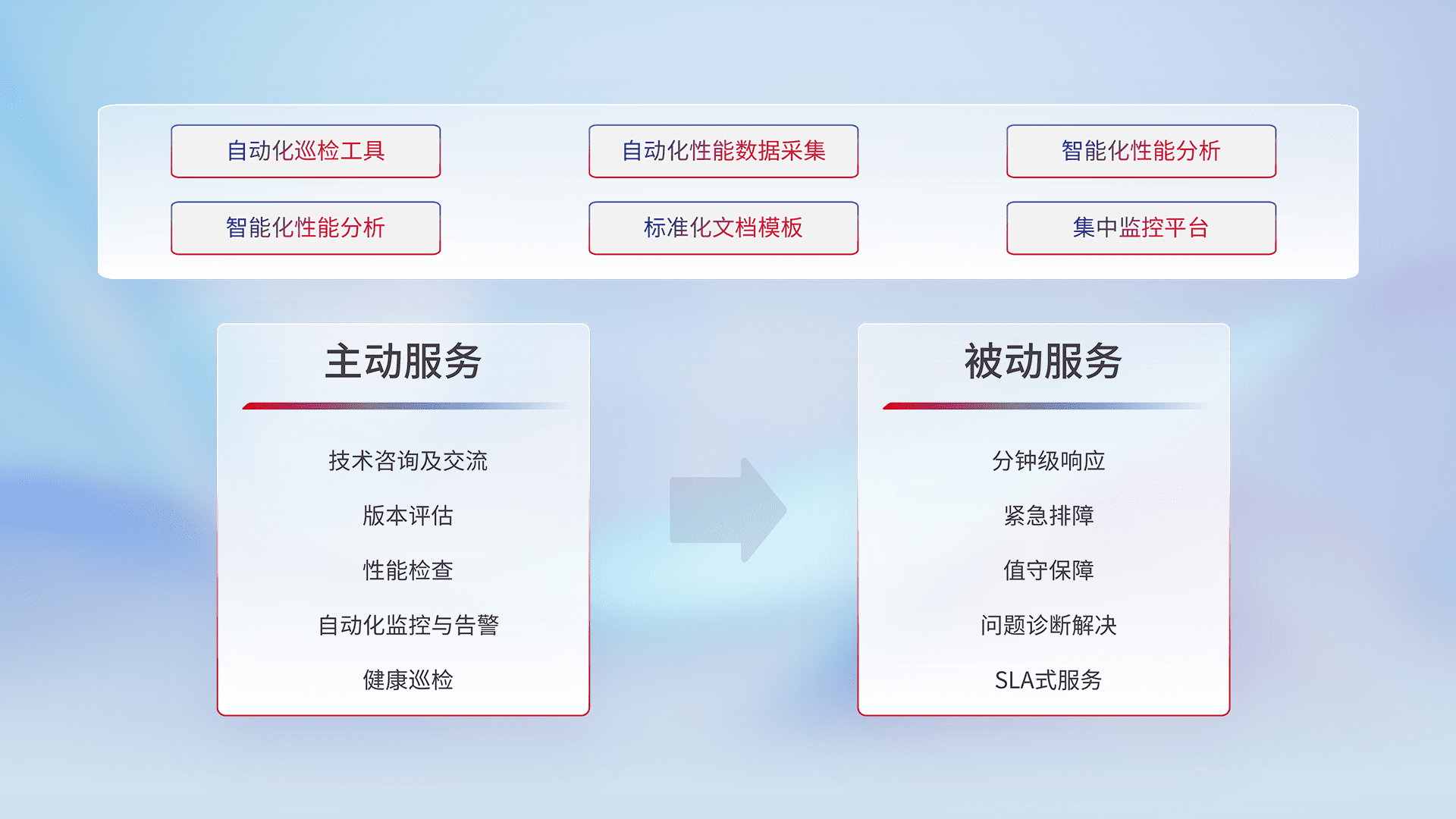 智能化工具和标准化文档,,,,保障服务质量,,提供主动服务(包含技术咨询、、、版本评估、、性能检查、、、自动化监控与告警、、、、健康巡检)和被动服务包含(分钟级响应、、紧急排障、、值守保障、、、、问题诊断解决、、SLA服务)。。。。